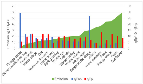 The results of the comprehensive assessment of economic, energy and environmental impacts of crop growing are based on the determination of individual soil and climatic parameters of the locations where the crops are cultivated. Altogether, the assessment covered a selection of 20 crops and different options for their use. The assessment of economic indicators builds on the calibrated economic results of agricultural holdings—namely, on the average of the last 5 years. Therefore, the results are stable and independent of the respective year. The economic and energy indicators are based on the cost–benefit analysis, which facilitates the evaluation of the absolute profit per hectare of the agricultural land in monetary or energy terms. These indicators are shown in the figures and tables as the attained efficiencies according to Relationships (4) and (5). The environmental indicators are related to the produced energy in production including straw.