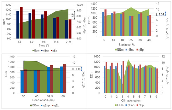 From the above dependencies, the importance of land and climate configuration indicators is obvious. Due to the slope of soil, the energy efficiency decreases most significantly, namely, by 1.58, while due to the stoniness of soil there is a decrease of 1.54, and due to the depth of soil, of 1.29. Due to the difference in climate regions of 0.94, the difference in economic efficiency decreases in similar relations, and in absolute values less significantly (values in the graphs are multiplied by 10), but the percentage of the decrease is more pronounced. The percentage changes of all indicators are given in Table A10, Table A11, Table A12 and Table A13.