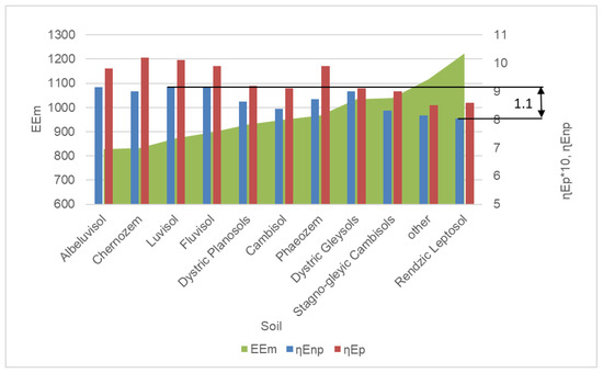 EEm, ηEnp, and ηEp among the main types of soil in average of crops.