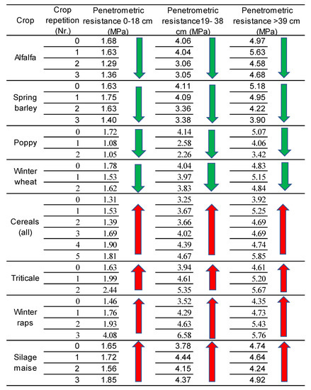 The impact of crops on soil compaction was evaluated from a survey conducted in the years 2002–2011; the assessment of the impacts on soil was based on the penetrometric resistance of soil, which is an appropriate indicator of the overall conditions of agricultural land [47,48], bearing in mind the need to obtain information on deeper layers of soil on large areas. Soil penetrometric resistance is closely related to soil-organic carbon (SOC) formation, where soil resistance decreases with higher soil content [49].