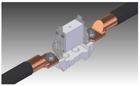 Currently, fuse links are also designed by manufacturers in accordance with the standard PN-EN 60269-1, PN-HD 60269-2. The scope of the standard includes standardized methods of testing fuse links, which are used in accredited laboratories to conduct type tests and tests of conformity of the manufactured devices with the given requirements of the standard. The performed tests allow to check the operation and construction of the apparatus, which was previously designed in 3D software, the simulation analysis of which could include some simplifications. Additionally, type testing is necessary to obtain a certificate for the product that the manufacturer wants to introduce to the market. In this work, a fuse link with a rated current of 100 A was subjected to tests in order to check the temperature fluctuations in the current circuit elements. A schematic of the layout used for laboratory measurements is shown in Figure 2 below.
