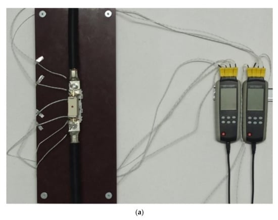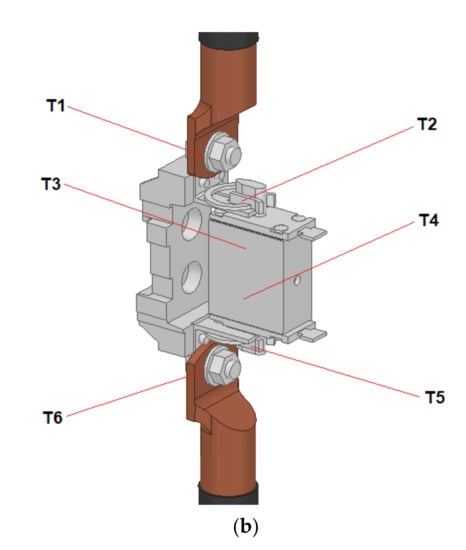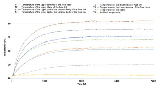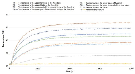 Thermocouples were installed in different places of the device, as it is seen in Figure 3. This made it possible to perform the measurements in accordance with the above standard. Type K thermocouples were fixed using a special thermally conductive glue on the elements of the current circuit: upper and lower terminals (T1; T6); upper and lower electrical contacts (T2; T5—fuse link knives); on the fuse link body (T3; T4); T7 for measuring ambient temperature and T8 for measuring the power supply cable’s temperature. The places where the thermocouples were installed depended on the previously performed computational analyses for the 3D model of this fuse link type in order to compare the obtained results.