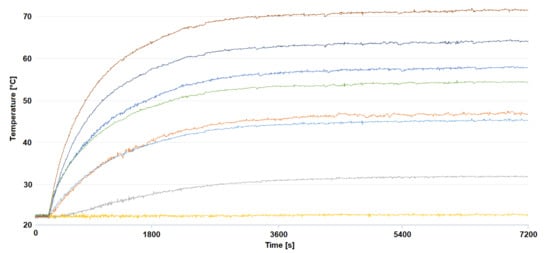 For the purpose of validating the simulation results obtained with experimental tests, heating time histories were generated using the “Temperature Probe” option. Obtained waveforms were consolidated into one chart using the “Chart plot” function. Temperature charts are presented in Figure 11 below.