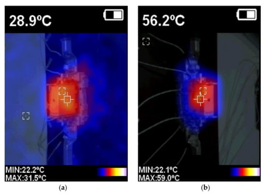 Screens captured from a thermal imaging camera during analysis: (a) after 5 min; (b) after maintaining the set temperature.
