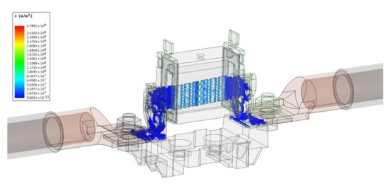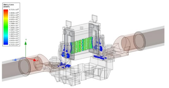 The first coupled analysis was performed with the ANSYS Workbench using the coupled Maxwell 3D and Transient Thermal environments. This analysis made it possible to obtain precise results linked to the nominal current flowing through the fuse. The highest current density and ohmic losses in the fuse link, shown in Figure 8 below, were achieved on a fusible element inside the ceramic body. The effect of the current flow through the circuit breaker circuit was the generation of power losses in the form of released heat, presented in Figure 9 below. A thermal analysis was performed after the calculations related to the current flow. Further importation of data allowed calculating the temperature distribution obtained on the fuse link circuit. The highest temperature value, equal to 63 °C, was reached on the ceramic body.