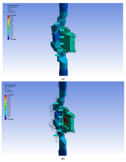 The authors did not reduce the thermal analysis only to the presentation of the results concerning the contact (insert knives). Six places on the apparatus were chosen for thermal analysis. The results were consistent across all comparative tables. The graphs (Figure 4 and Figure 11) which show the waveforms from simulations and empirical tests indicate not only similar values of the set temperature but also the nature of the changes.