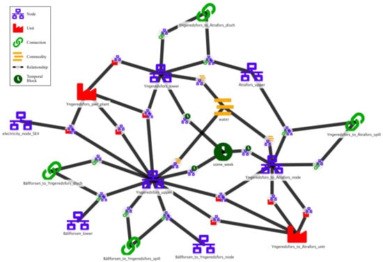 - two connections with the downstream power plant represent and , (Yngeredsfors_to_Ätrafors_disch and Yngeredsfors_to_Ätrafors_spill, shown in Figure 4, model the discharge and spillage, respectively).