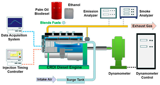 The engine tested in this study is a turbocharged four-cylinder CRDI diesel engine with a displacement of 1991 cc and with the exhaust after-treatment device removed. The engine specifications are listed in Table 2. The engine speed and load were controlled by an eddy current dynamometer (DY-230 kW, Hwanwoong Mechatronics, Gyeongsangnam-do, Korea). The pressure in the cylinder was measured by a piezoelectric pressure sensor (Type 6056A, Kistler Korea Co., Ltd., Gyeonggi-do, Korea) and recorded on a data acquisition board (PCI 6040e, National Instruments, Austin, TX, USA). The fuel consumption of the engine was determined using a high-precision digital electronic weighing balance (GP-100K, A&D Co., Ltd., Tokyo, Japan). MK2 (GreenLine MK2, Eurotron (Korea) Ltd., Seoul, Korea) and HPC-501 (Nantong Huapeng Electronics Co., Ltd., Jiangsu, China) multi-gas analyzers were used to measure CO, HC, and NOx emissions. The smoke opacity of the exhaust gas was measured by an OPA-102 smoke meter (QROTECH Co., Ltd., Gyeonggi Province, South Korea). The engine speed was set at 750 rpm to simulate idling, and the load was set to 30, 40, and 50 Nm to simulate the operation of vehicle accessories. Pilot injection timing was adjusted to 18 °CA BTDC, and the main injection timing was at 5 °CA BTDC. The injection pressure was fixed at 350 bar. The engine operating environment was maintained at 25 °C, and the cooling water temperature was 85 °C when the engine was running smoothly. The experimental and operating conditions are shown in Table 3. Figure 1 illustrates the engine test system.