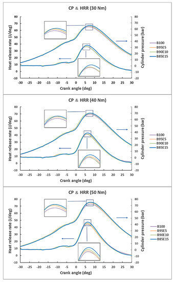 As the load increases at idling speed, the peaks of CP and HRR increase; additional ethanol also helps increase the peaks. The results showed that the maximum increase in CPmax for adding 5, 10, and 15 vol% ethanol is 2.33%, 3.29%, and 3.7%, respectively, and the heat release rate is 4.83%, 7.82%, and 11.64%.