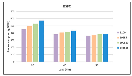 Braking-specific fuel consumption (BSFC) of blended fuels under loads of 30, 40, and 50 Nm.