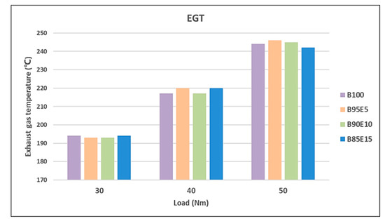 Exhaust gas temperature (EGT) of blended fuels under loads of 30, 40, and 50 Nm.