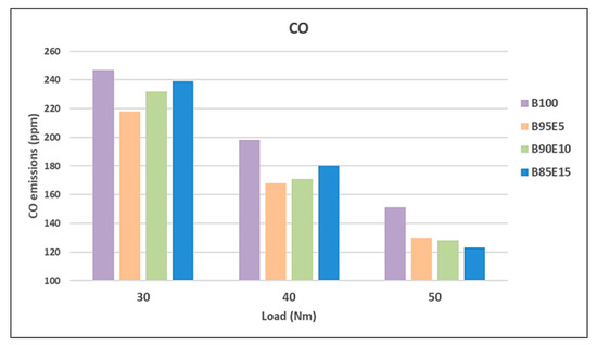 The CO emissions from the engine are shown in Figure 7. Obviously, the CO emissions of all fuels decrease as load increases. This might be because the pressure in the cylinder increases with load, and a larger pressure in the cylinder is conducive to more complete fuel combustion, which is consistent with the variation in cylinder pressure peak reported previously [3]. Under all tested loads, all ethanol-containing fuels showed good CO emission reduction effects. However, under loads of 30 and 40 Nm, CO emissions slightly increased with increasing ethanol concentration. This is because the ethanol in the blended fuel contains a large amount of hydroxyl groups, and the release of hydroxyl groups in the cylinder is beneficial to the oxidation of CO to CO2, thereby reducing the presence of CO [3]. However, the higher latent heat of vaporization of ethanol reduces the gas temperature in the cylinder [26,33] and complete oxidation of CO cannot be achieved [33]; fuels with higher concentrations of ethanol at low loads produce higher CO emissions.