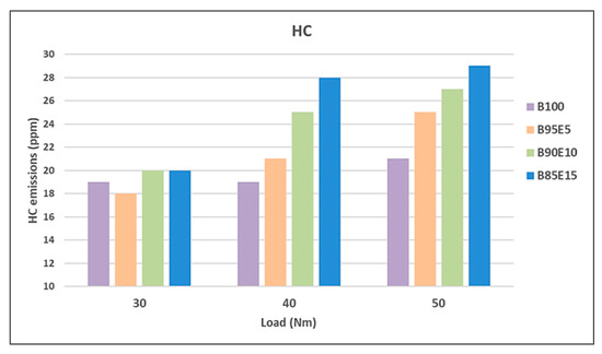 HC emissions of blended fuels under loads of 30, 40, and 50 Nm.