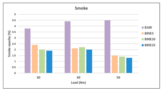 The contribution of ethanol to smoke reduction is significant, as shown in Figure 10. As load increases, more fuel is injected into the cylinder, resulting in a greater equivalence ratio and greater fuel-rich area [38]. Therefore, a higher load promotes the formation of smoke from pure biodiesel. After adding ethanol, the smoke emissions of blended fuels are distinctly reduced, and as ethanol content increases, the reduction in emissions is greater. Ethanol increases the oxygen concentration in blended fuel and improves the combustion quality. Its lower carbon/hydrogen ratio inhibits the formation of particles and facilitates the oxidation of particles [26]. The greater latent heat of vaporization of ethanol reduces the temperature in the cylinder, and the longer ignition delay of the blended fuel is conducive to better mixing of oil and gas [26]. The smoke emissions of the ethanol-biodiesel blends did not increase with increasing load like they did in pure biodiesel. Ethanol had the greatest emission reduction effect under a load of 50 Nm, where 15% ethanol contributed a maximum reduction of 71%.