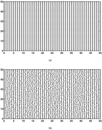 where is the coefficient of shear viscosity, and is the coefficient of bulk viscosity. A quantitative assessment of the method’s two setups, including the temporal decay of a standing plane wave in a periodic domain and the spatial decay of a propagating planar acoustic pulse of Gaussian shape for regular and irregular nodal distributions (shown in Figure 1a,b) are discussed below. It should be noted that the default nodal arrangement is a regular distribution; the base units are in the LB system.