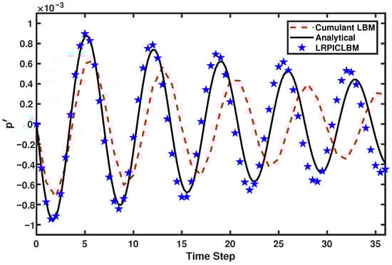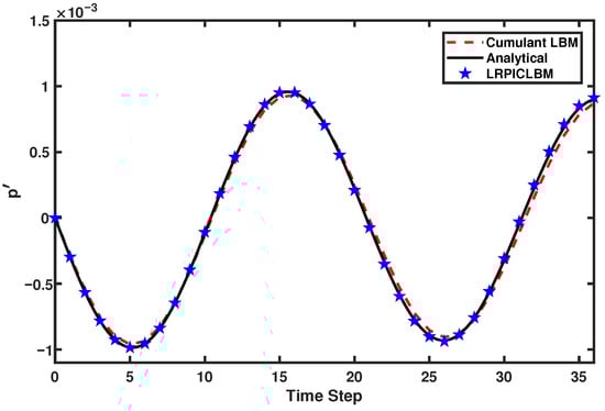 The acoustic pressure time history for () with points per wavelength is presented in Figure 3. It shows the comparison between the analytical solution, the cumulant LBM and the LRPIC-LBM numerical solution at low viscosities. One of the most problematic issues in the BGK LBM is the low viscosity limit, which makes the solution unstable. However, the cumulant LBM, with phase speed and temporal dissipation rate errors of less than 1 percent, as in reference [26], did not present difficulties at low viscosity. Although both approaches were successful, the new method exhibited better performance, closely following the theoretical result for the same viscosity value.