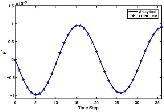 The choice of the time step size has an influence on the accuracy and stability of the solution. A smaller time step leads to more accurate results, especially in a hyperbolic partial differential Equation (PDE). To minimize the phase speed and dissipation rate errors, the time step was reduced. Figure 5 shows the acoustic pressure time history for () with points per wavelength and . The LRPI-CLBM replicates the analytical results with negligible errors. Therefore, this method makes it possible to predict wave motion more accurately with no dependency on the number of points per wavelength .
