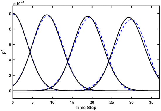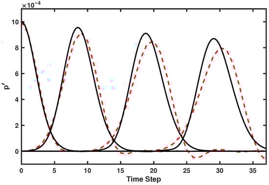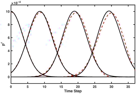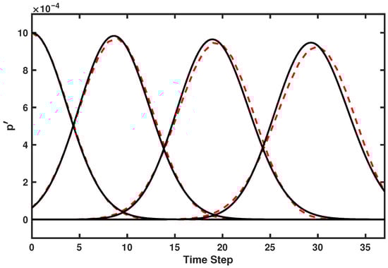 To assess the accuracy of the LRPIC-LBM in simulating the pulse wave emission, we proceeded as in reference [26]. Different viscosities and resolutions (which are related to the choice of ) were studied. Figure 7 depicts the acoustic pressure time history for () with . The cumulant LBM results (dashed red line) are compared to the LRPIC-LBM (solid black line). As stated in [25,26] the intensity loss at any location is proportional to the distance of propagation, regardless of the precise location. Thus, the data were extracted from the center of the domain, and at 5, 11, and 17 nodes apart from the center. For resolutions up to , deviations between the cumulant LBM and the LRPIC-LBM results were less than 1 percent.