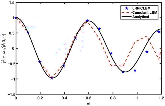 Like the parameter introduced in the temporal analysis of the first set up, is another effective parameter used in spatial analysis which affects the accuracy of the LBM results.The acoustic pressure time history is depicted in Figure 9 for (), with . It shows that the deviations between the cumulant LBM and the LRPIC-LBM results increase after the reduction of . The wiggling observed in the results of the cumulant LBM is due to the reduction of the number of nodes inside the pulse, which brings the accuracy of the results into question. However, the LRPIC-LBM graphs are smooth and unaffected by the lesser number of nodes. To better assess the accuracy of the LRPIC-LBM compared to the cumulant LBM, the data shown in Figure 9 were compared with the analytical results. The Fourier transform of the pressure time history of the passing wave yields the Fourier coefficient of pressure which is the solution to Equation (26) [25]. Figure 10 shows the ratio as a function of angular frequency for the analytical solution. This figure shows that the LRPIC-LBM is more successful than the cumulant LBM at predicting theoretical results with . Thus, this method can model wave propagation more accurately even at smaller resolutions.