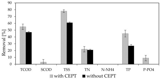 Further intensification of the process could be achieved by including a second reagent. Apart from coagulant dosing, the addition of small doses of flocculants in the range of 1–10 mg/L might improve the effect as presented in previous works [,]; however, it requires additional installation and generates additional operating costs. Another alternative is microsieving to gain a higher removal of 70–80% COD [].