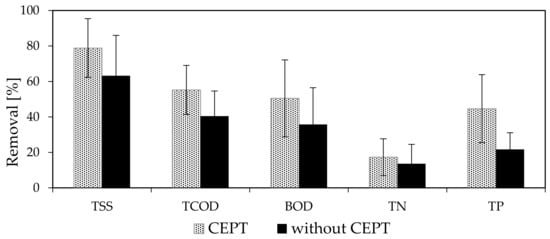 The addition of a coagulant strengthens organic matter capture and enhances sedimentation. TSS removal could increase from 80% to 90%, while COD removal could increase from 50% to 70% []. In our full-scale trials, a significant improvement in contaminant removal was noticed right after the coagulant dosage was initiated. The average contaminant reduction in the primary step during the simple sedimentation (without coagulation) equaled 63%, 40%, 36%, 14%, and 22% for TSS, TCOD, BOD, TN, and TP, respectively, whereas during the CEPT period, it was significantly higher and equaled 79%, 55%, 50%, 17%, and 45% for TSS, TCOD, BOD, TN, and TP, respectively. The results were comparable to the ones for the pilot-scale trials, but an additional beneficial change was observed for TP removal (Figure 2).