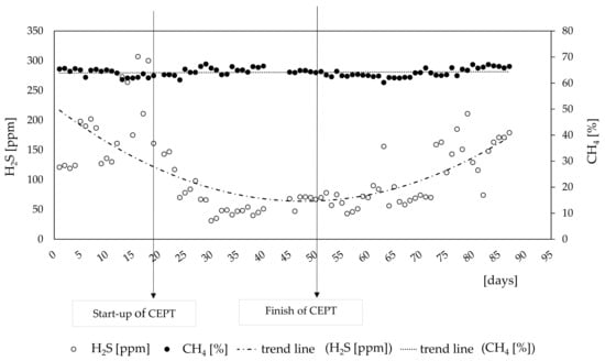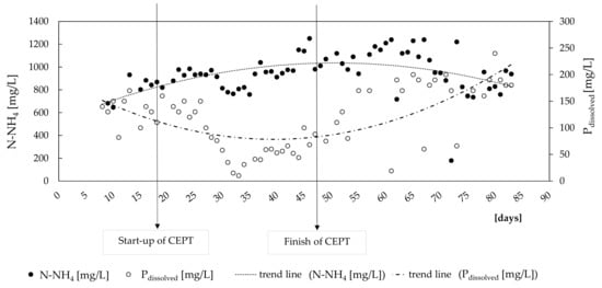 Similar results were reported by [], e.g., a decrease in H2S from up to 13,250 to <200 ppm was also noted for FeCl3 application. H2S is an undesirable component of biogas due to its corrosion properties; hence, it is recommended to remove H2S prior to combined heat and power (CHP) below 150 ppm to minimize such a risk []. In practice, each CHP installation is equipped with a biogas purification step, which generates additional operational costs; therefore, decreasing H2S would have a positive impact on the overall costs of produced energy [,]. As stated, CEPT reduces H2S; hence it decreases not only the costs of biogas upgrading but also the cost of operation and maintenance of CHP units by reducing the frequency of inspections and oil changes. Furthermore, the application of CEPT results in a decrease in the phosphorus concentration in the digestate. On the one hand, it is beneficial because it reduces the amount of phosphorus contained in the dewatering liquors and decreases P loading, which recirculates to the main line. On the other hand, it unfortunately could limit the possibility of P recovery in the form of struvite []. The average amount of Pdissolved was 75.0 mg/L, which was lower by 52% compared to the non-CEPT period. A sharp decline of Pdissolved (from 160 mg/L to 10 mg/L) was observed during the first 4 months (Figure 4).