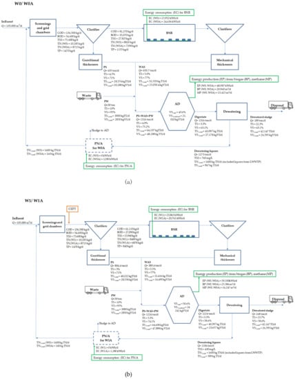 The greatest benefit of CEPT is the ability to increase biogas production. CEPT application caused changes in PS to WAS proportions directed to AD. As calculated, CEPT application decreased WAS production by 34% and enhanced PS recovery by 40% (Figure 5). In addition, the biogas potential is higher for CEPT sludge []; hence, the energy from biogas in scenarios with CEPT (W1 and W1A) calculated according to Equation (2) increased by 21% (Figure 5). The 43% of VS red in W0/W0A and 50% VSred in W1/W1A were adopted strictly from the full-scale tests. Enhanced reduction in VS in AD in the scenario with CEPT application resulted in a decrease in VS content in digested sludge from 63.1% (W0 and W0A) to 58.6% VS (W1 and W1A). VS concentration is crucial for dewatering abilities and could significantly change the amount of dewatered sludge. Calculated using Equation (3), the TS of sludge cake was equal to 22.3% an 23.7% for W0/W0A and W1/W1A, respectively, which could be translated into 11% lower amount of dewatered sludge for final disposal (Figure 5). The calculations are presented in Table S4 (Supplementary Materials).