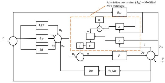 Adaptive controllers have gained wider attention because of their ability to adjust automatically to the unknown disturbances and model uncertainties occurring in the system. Among the adaptive control schemes, the Model Reference Adaptive Control (MRAC) finds its wider application in non-linear systems because of its simplicity and its ability to fine-tune the response characteristics of any system using a reference model [3]. The MRAC structure consists of four major components: the process model, the reference model, the control scheme, and the adaptation mechanism. Research studies are carried out with variations in a control scheme, such as Proportional Integral and Derivative (PID) with intelligent controls or optimal control schemes, and variation in the adaptation mechanism with more heuristic approaches for several kinds of applications [4]. Various controllers were implemented for the MAGLEV system in the literature, which is discussed as follows. A Static and Dynamic Sliding Mode Control (SMC) was implemented for MAGLEV to enhance the robustness for the variation in the system parameters [5,6]. Adaptive learning rules are used to learn the unknown parameters [7]. An adaptive robust nonlinear controller was proposed for the position tracking problem of a magnetic levitation system. However, the sensor measurements were found to be inaccurate due to continuous occurrences of disturbance. A combination of adaptive and robust control was found to improve the transient behaviour of the system and the same was verified by simulation and Finite Element Analysis (FEA) [8]. A non-linear Model Predictive Control (MPC) was proposed by deriving a non-linear dynamical model of the MAGLEV system and it achieved high performance for the stabilization and rapid set point changes of the levitating object. A robust controller was designed by combining the feedback linearization and H-infinity controller to control the ball position and mitigate the effects of external disturbances [9]. Feedback linearization controllers were also implemented to attenuate high-frequency disturbances. The progress in superconducting MAGLEV technology is encouraging innovations in MAGLEV transportation applications. Automatic controllers are designed for non-linear MAGLEV systems in which the controller parameters were tuned automatically using metaheuristic algorithms, which enhances design flexibilities [10]. A comparative analysis of MIT tuning rule-based control and Differential Evolution (DE) algorithm-based control was carried out for a MAGLEV system. The analysis revealed that the DE-based offline tuned PID controller performance is better than that of the MIT rule-based online tuned PID controller [11]. While in the usage of adaptive control schemes, in a standard MRAC, to rapidly reduce the tracking error, high-gain control behaviour is exhibited by using larger adaptive gain to achieve fast adaptation. Such a high gain control produces high-frequency oscillations leading the system to instability. Therefore, a faster adaptation approach was proposed based on minimizing the squares of the tracking error without affecting the robustness [12]. Also, various MRAC schemes were proposed based on different controller approaches and adaptation mechanisms [13,14,15]. In this study, a simple control approach with adaptation capability is applied to the MAGLEV system. The performance of the proposed Enhanced MRAC scheme is compared with that of the conventional Proportional Integral Velocity with Feedforward Control (PIV+FF) scheme. One of the simplest and the most effective adaptive control scheme is the Model Reference Adaptive Control Structure (MRAC), as shown in Figure 2. As the name suggests, the scheme is employed with a reference model . The deviation between the output of the actual plant model and the reference model is periodically corrected using the controller . In the MRAC scheme, the controller parameters are updated using an adaptive mechanism . Figure 2 outlines the MRAC scheme. Gradient descent or an MIT tuning approach is the most preferred adaptation technique in the MRAC scheme. The MIT rule states that loss function must be minimized. This is achieved by changing the theta parameter in the direction opposite the gradient’s direction, which is denoted by Equation (1). The conventional MRAC scheme is further upgraded into Enhanced Model Reference Adaptive Control (EMRAC) Scheme as shown in Figure 3.