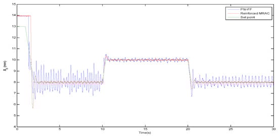 The MRAC scheme shown in Figure 3, in general, employs a P or PI or Proportional-Integral-Derivative (PID) control structure. In the Proportional-Integral-Derivative (PID) scheme, the parameters are tuned concerning the position error at that instant of time whereas, in PIV, the corrections are based on both the position and velocity error information. This makes the later performance more precise than the former scheme. Also, PIV is mostly preferred in motion control applications. In this study, PIV + FF is utilized as a control structure with a standard modified MIT adaptation mechanism and the performance analysis is carried out for the non-linear unstable MAGLEV system. The proposed enhanced MRAC control scheme consists of four gains, namely and the adaptation mechanism consists of two tuning parameters, namely the adaptation rate and amplification gain . The controller gains are evaluated by a direct comparison method where the closed-loop ball position characteristic equation is compared with the characteristic equation, which possesses the desired time domain specifications, which include mainly the overshoot and settling time parameters. The reference model is chosen following the expected behaviour of the system as time progresses. Proportional-Integral-Velocity (PIV) controllers are generally employed for precise motion control applications. However, this structure inherently produces some offset, which is compensated with a Feed-Forward (FF) controller. The capability to learn and adapt to the changes with the extra bounded condition imposed as a time-domain specification in PIV + FF makes MRAC into enhanced MRAC.