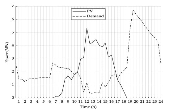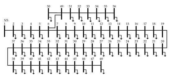 The distribution network used in this study is the seventh feeder of Nakhon Phanom substation, Thailand, which is a 56-bus distribution network as shown in Figure 1. The first bus is defined as the slack bus, and the detailed data of real and reactive powers at each bus and line impedance are provided in Table A1 in Appendix A, in which the base voltage is 12.66 kV, and the base power is 10 MVA. The PV (5.88 MW) was installed at the 47th bus and the output power of PV can be found in Table A2 in Appendix A. The load magnitudes of each bus at each time are defined according to Equations (19) and (20) for real power and reactive power, respectively. The PV power and load demand of the 56-bus distribution network are presented in Figure 2, in which these data are provided by Provincial Electricity Authority (PEA), Bangkok, Thailand. These PV power and load demand are chosen from the data collected over a year where the day when the reverse power flow reached the highest value was selected. Therefore, this study could improve the performance of the worst day and cover the problem of the other days.