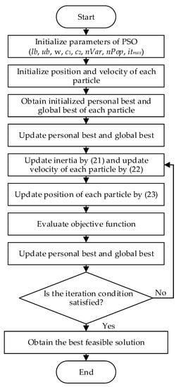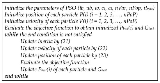 The principle of PSO for solving optimization problems is inspired by the foraging behavior of a flock of birds or fishes [52]. The steps of the PSO process for solving problems are as follows: In the first step, the number of populations or particles () is defined where each particle consists of decision variables (), the starting position of each particle is initialized, and its velocity is initially set to zero. Afterward, the objective function is evaluated by using the initial positions and velocities of the particles, and then the initial personal best () of each particle and the initial global best () are obtained (the global best is the best particle among all personal bests). Following this, the inertia is calculated according to Equation (21). The velocity of each particle is then updated by Equation (22), and the position of each particle is also updated by Equation (23). The updated position of each particle is substituted to evaluate the objective function. Then, the personal best and global best are updated. Repeat the process until the maximum iteration is reached. The flowchart and pseudo-codes of PSO are shown in Figure 3 and Figure 4, respectively.