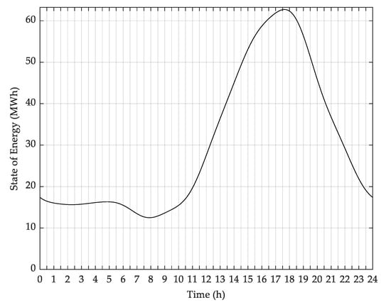 The SoE of the BESS at the 47th bus over 24 h from 00:00 a.m. is presented in Figure 7 to observe when the BESS is charging or discharging, and charging/discharging rate can be obtained. It is noticeable that the energy of the BESS was slightly changed from 00:00 a.m to 6:00 a.m. and continuously decreased until reaching the lowest value, which is around 12.50 MWh, at 8:00 a.m. From 8:00 a.m. to 6:00 p.m. (at the 18th hour), the energy of the BESS was sharply increased until the maximum value, which is approximately 62.72 MWh. After that, the BESS was discharged from the maximum energy to its initial value at the last hour. It is found that the energy of the BESS was increased in the time when PV supplied energy to the network (6:30 a.m. to 6:00 p.m.) because BESS stored surplus energy from PV, which exceeded the demand in the network. Despite the discharge of some energy from 6:30 a.m. to 8:00 a.m., this was due to the network performance improvement by mainly considering the objective function. In the period when supply from PV was stopped, the SoE of BESS was also dropped to supply the stored energy back to the network. This could verify that the BESS could efficiently balance the supply and demand of the network.