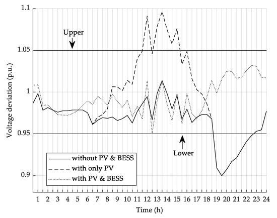 The voltage deviations index () comparison of each case was obtained, as shown in Table 2. It can be derived that of case 3 is the lowest (146.46%), which means that the BESS installation could improve the voltage profile of the distribution network with the connected PV. In Figure 8, the voltage profile of the 48th bus where the voltage deviation problems are the most frequently detected in the distribution network over 24 h is presented. For cases 1 and 2, it was found that the voltage level was lower than the lower bound of the voltage limit from 6:30 p.m. (the 18th hour and a half) to 11:00 p.m. (the 23rd hour). In addition, for case 2, the voltage level was higher than the upper bound of the voltage limit from 11:30 a.m. (the 11th hour and a half) to 3:30 p.m. (the 15th hour and a half). For case 3, installing the BESS at the 47th bus could maintain the voltage level within the voltage limit range over 24 h.