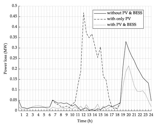 The real power losses of all three cases over 24 h are displayed in Figure 9. For case 1, the real power loss was continuously less than 0.05 MW from 00:00 a.m. to 6:30 p.m. (the 18th hour and a half), however, after that the real power loss of this case was considerably increased until reaching the maximum value at 7:30 p.m. (the 19th hour and a half), which is equal to 0.33 MW. For case 2, the real power loss has occurred the same as case 1 except for the period from 6:30 a.m. (the sixth hour and a half) to 6:30 p.m. (the 18th hour and a half). Especially, the loss for case 2 dramatically climbed to the highest point, which is 0.47 MWh at the 12th hour, and during the time from 10:30 a.m. (the 10th hour and a half) to 4:30 p.m. (the 16th hour and a half), the real power loss of this case was more than those of cases 1 and 3. For case 3, the real power loss was slightly more than those of cases 1 and 2 during 2:30 a.m. (the second hour and a half) to 5:00 a.m. (the fifth hour) and was slightly more than that of case 1 from 11:30 a.m. (the 11th hour and a half) to 3:30 p.m. (the 15th hour and a half). Moreover, the real power loss of case 3 was less than those of both cases 1 and 2 in the other period. The summation of the power losses including real power loss, reactive power loss, and apparent power loss over 24 h of all three cases are presented in Table 2. It is found that case 2 met more power loss than those of cases 1 and 3, especially, the real power loss of case 2 was equal to 5.90 MW, which was much more than those of case 1 (2.89 MW) and case 3 (4.10 MW).