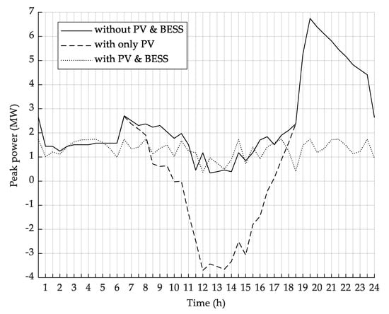 The peak demand is considered from the real power flow at the slack bus over 24 h, in which the positive value of the real power flow indicates the power flowing into the network and the negative value of the real power flow indicates power flowing out of the network.