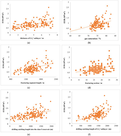 Scatter diagram of (a) EUR and thickness of L111 sublayer, (b) EUR and gas saturation, (c) EUR and fracturing segment length, (d) EUR and fracturing section, (e) EUR and drilling catching length into the class I reservoir, and (f) EUR and drilling catching length of L111 sublayer.