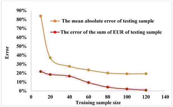 The error of the sum of EUR of 40 gas wells in the seven schemes of testing samples also gradually decreases with the increase of the training sample size. When the training sample size is 60 gas wells, the error is less than 10%, and when the sample size is 120 gas wells, the error is only 0.83%.