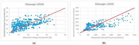 Comparison of calculated versus measured values using Ozbayoglu’s model [48]: (a) total cuttings concentration and (b) frictional pressure loss.