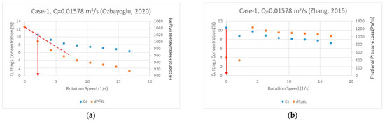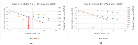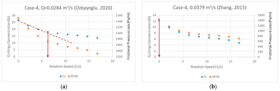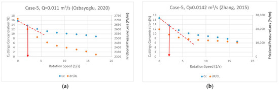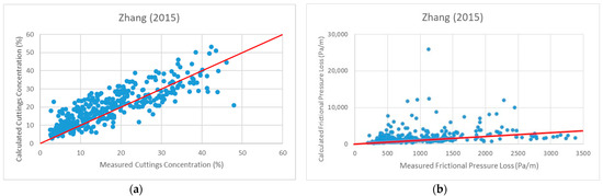 Comparison of calculated versus measured values using Zhang’s model [47]: (a) total cuttings concentration and (b) frictional pressure loss.