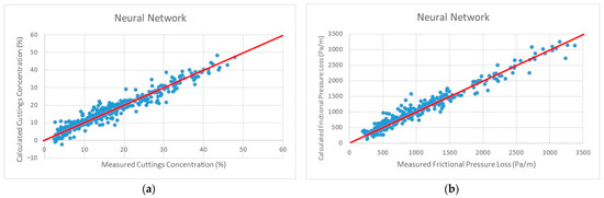 Comparison of calculated versus measured values using the neural network model: (a) total cuttings concentration and (b) frictional pressure loss.