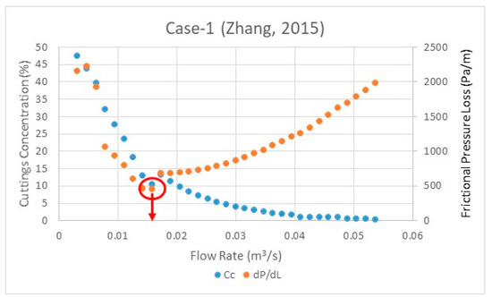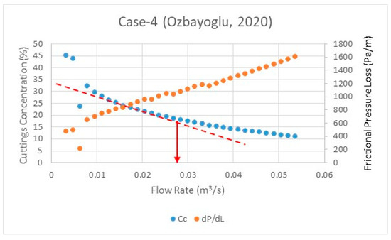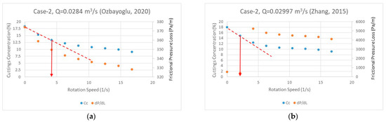 A flow rate and pipe rotation speed optimization attempt was introduced using the genetic algorithm, considering effective hole cleaning while satisfying a fitness function, as provided in Equation (1). The genetic algorithm provides the “best” flow rate for a given rotation speed for effective hole cleaning using a fitness function and aims to minimize cuttings concentration and frictional pressure loss (Equation (1)). Once these results were collected, an optimization process was performed to determine the “best” flow rate and pipe rotation speed combination while considering a cutoff cuttings concentration as a constraint by coupling an objective function depending on flow rate and pipe rotation speed (Equations (8) and (9)). Detailed information about this process is defined in Section 3.2.1.