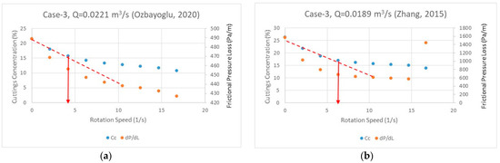 However, the frictional loss estimation performances are quite different, as seen in Figure 2b and Figure 3b. The average percent differences between the measured and calculated values for Ozbayoglu’s model and Zhang’s model are 35% and 110%, while the average relative differences are 370 Pa/m and 1070 Pa/m, respectively. Ozbayoglu’s model seems to estimate the frictional losses to be slightly less than the measured values. However, more significant discrepancies are observed in Zhang’s estimations. Considering the fact that, in Zhang’s model, the constitutive equation coefficients (such as friction factors) are calibrated for conventional annular geometries, i.e., Inner Diameter/Outer Diameter (ID/OD) is around 0.5, the model performance may be lower at a narrow annulus.