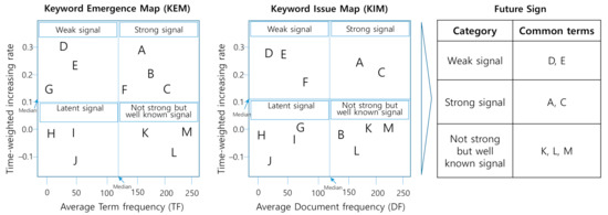 Figure 1 below shows the existing method of searching for future signs using text mining. The keyword emergence map (KEM) is based on term frequency (TF), and the keyword issue map (KIM) is based on document frequency (DF). Additionally, the signals extracted from KEM and KIM are presented as future signs.