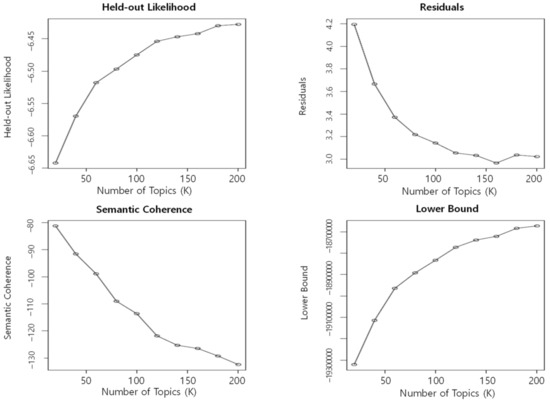 This study carried out STM using the R package called “stm” and used a function called “search” provided in the stm package to find the appropriate number of topics. The stm package extracts a user-determined number of topics but provides indices such as held out likelihood [50] and residuals [51] to determine the appropriate number of topics based on the data.