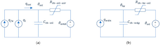 Circuits for analyzing the thermal behavior of the transformers: (a) Top-oil temperature model; (b) Hot-spot temperature model.