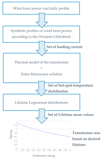 In this paper, the optimal rating of transformers connecting wind power plants has been dealt with by taking into account the probabilistic analysis of lifetime degradation. The Ornstein–Uhlenbeck stochastic approach was used to generate synthetic wind turbines power profiles, as well as synthetic thermal transformer profiles which allowed formulating the aging of transformers. In the numerical application, the lifetime reduction was demonstrated to be distributed as a Lognormal process allowing to easily derive the rated current corresponding to an aging acceleration factor equal to that obtained in correspondence of the rated hot-spot temperature, i.e., the standard lifetime duration assumed for the transformer. The results of the simulation showed that the proposed method is able to determine the increment of rated current required to get a standard lifetime duration without incurring a higher aging acceleration. This is particularly useful in the case of wind farm applications whose high wind power fluctuations do not modify the mean power value which leads to incorrect transformer sizing. The use of Ornstein–Uhlenbeck stochastic approach is able to capture the effect of these fluctuations in terms of lifetime reduction. Future application will be devoted to the combination of the proposed method with other sizing issues, which typically affect the aging of transformers of wind farms, including through the harmonic content, due to the use of wind power converters.