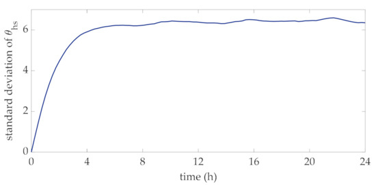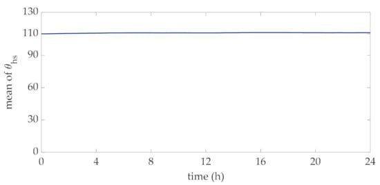 In order to perform the proposed method for the choice of the transformer rating, 10,000 daily profiles of wind power were obtained through the statistical characterization of the Ornstein-Uhlenbeck approach. These profiles were used to derive the distribution of hot-spot temperature at each time interval of the day. With reference to the rated currents corresponding to the mean values of this data set, in Figure 4 and Figure 5 the mean value and standard deviation of this temperature at each interval are reported. The mean values reported in Figure 4 reveal that they vary within a narrow interval around the rated hot-spot temperature, i.e., 110 °C, which corresponds to a standard lifetime duration assumed for the transformer. The profile of the standard deviation at each interval reported in Figure 5 clearly converges to a specific value, thus showing that the considered process can be assumed to be stationary.