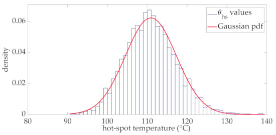 Regarding the hot-spot temperature, it can be stated that its distribution at each interval is Gaussian. This is verified by the results obtained by the adoption of the thermal model of Section 3 (step 3 of the of the flow chart in Figure 2). Particularly in Figure 6, the histogram of the hot-spot temperature corresponding to a generic interval of the day (the interval corresponding to the 12th hour) is reported together with its fitting Gaussian probability density function (pdf) which shows a good approximation with the simulated data. Mean value and standard deviation of this distribution are °C and °C.