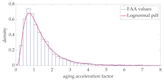 Histogram and fitting Lognormal distribution of the aging acceleration factor.