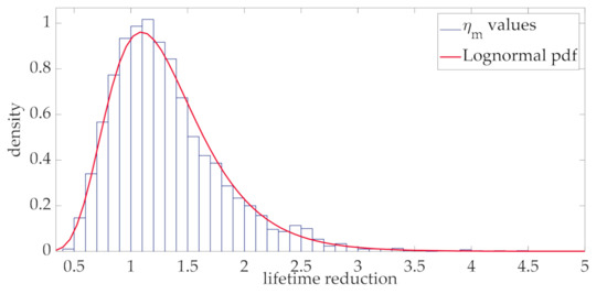 Coherently with the theoretical hypothesis made in Section 3, it was found that the distribution of the lifetime reduction values is well approximated by a Lognormal pdf, as clearly appears in Figure 8. This can be explained by considering that the lifetime is evaluated by means of (34) and the aging acceleration factor (31) is well approximated by a Lognormal distribution at each interval (Figure 7). In this case, even if the sum of Lognormal distributions is not generally lognormally distributed, the stationary property of the process implies that the Lognormal distribution can still be used to represent the integral in (34). It is worth noting that this result has general validity, since it derives from the statistical characterization of the wind power according to the Ornstein-Uhlenbeck stochastic process and a consolidated thermal model of transformers. In order to apply the proposed procedure at the design stage of the transformer with the purpose of choosing the rating of the transformer, the proposed approach was repeatedly applied by increasing values of the rated transformer current, as recalled in the flow chart of Figure 2 (step 5 of the flow chart in Figure 2). Figure 9 shows the lifetime reduction corresponding to the ratio of the rated and mean values of the loading current.
